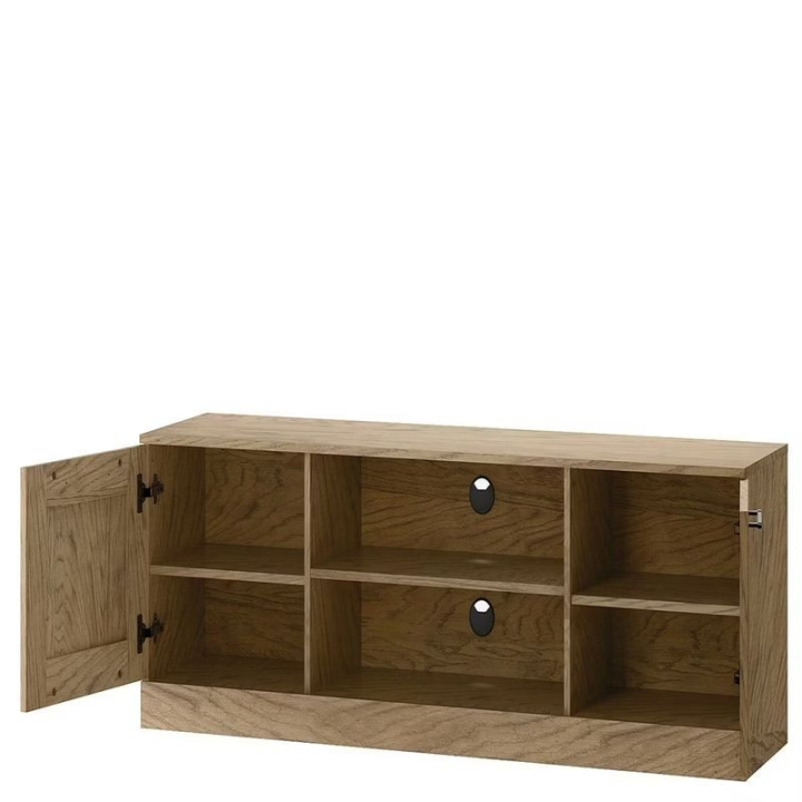 The cabinet has been designed with tidiness in mind for the media space. There are two openings in the back of the furniture, which allow cables from a set-top box, home cinema or other devices to be easily routed. The side hinges allow the doors to open freely, while the silent closing system ensures smooth closing. In addition, black metal handles emphasise the solid workmanship of the furniture.