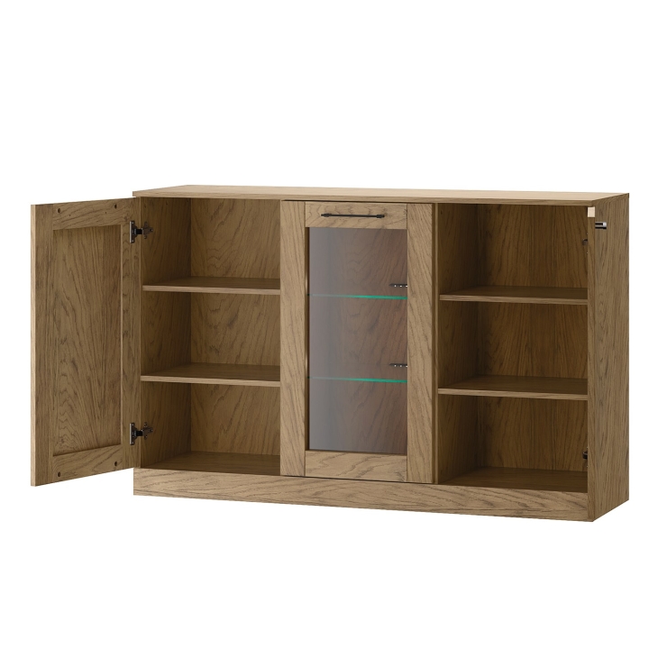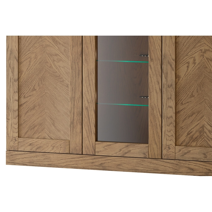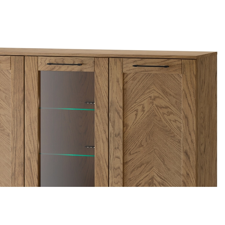 The Cozy 45 3-door chest of drawers from manufacturer Szynaka Meble is a unique piece of furniture that fits perfectly in any living room or dining room. With a width of 140 cm, a height of 90 cm and a depth of 42 cm, it offers a spacious storage area. The doors of the chest of drawers, one of which is glazed, conceal glass shelves which, thanks to the built-in LED lighting, perfectly display selected items. The fronts made of solid oak wood and natural veneer arranged in a herringbone pattern give the furniture its characteristic look in shades of oiled rustic oak.