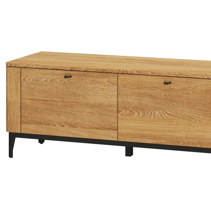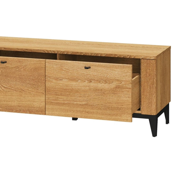 Metal handles and legs in black mat add a modern touch, while the oiled finish gives the furniture a depth of colour and protects the surface of the wood. An additional advantage is the quiet closing system, which ensures comfort of use. The Porto RTV cabinet is a carefully designed piece of furniture which will bring the warmth of natural wood and modern style to the interior.