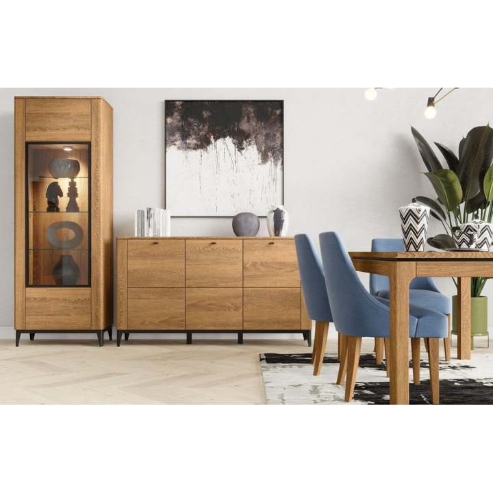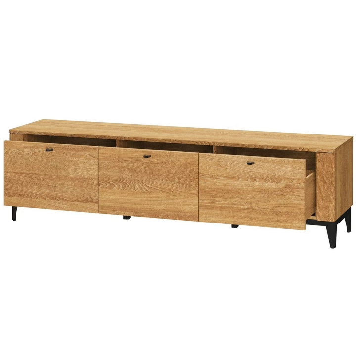The Porto RTV cabinet is equipped with three capacious drawers, which allow for storage and organisation of multimedia equipment and accessories. The fronts made of solid brushed oak wood are complemented by a furniture board body in natural oak veneer, which emphasises the careful workmanship and durability of the furniture. The inner part made of foiled furniture board in woodgrain décor is a practical solution that completes the whole.