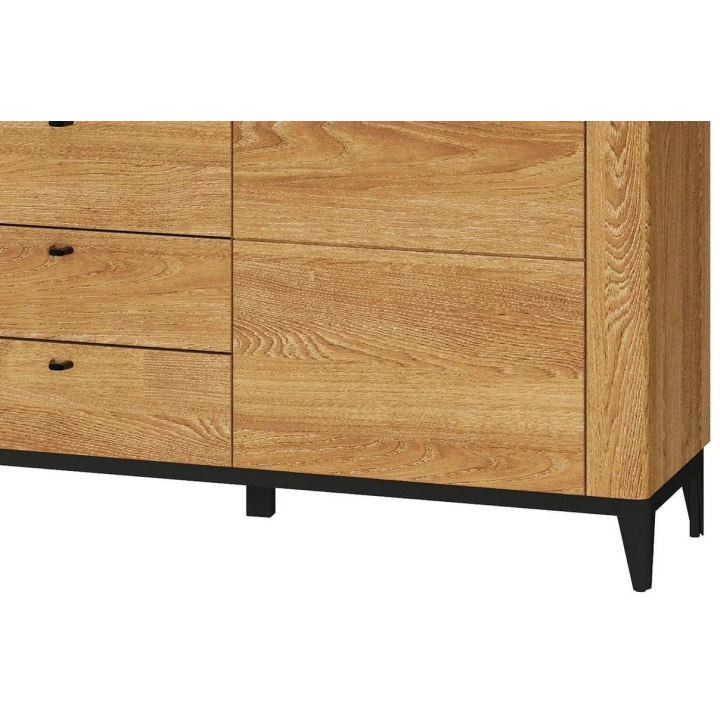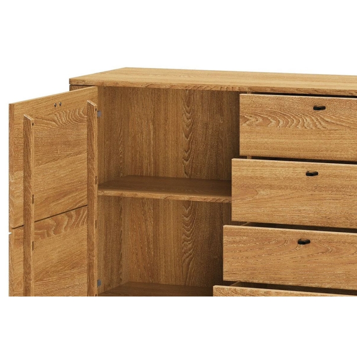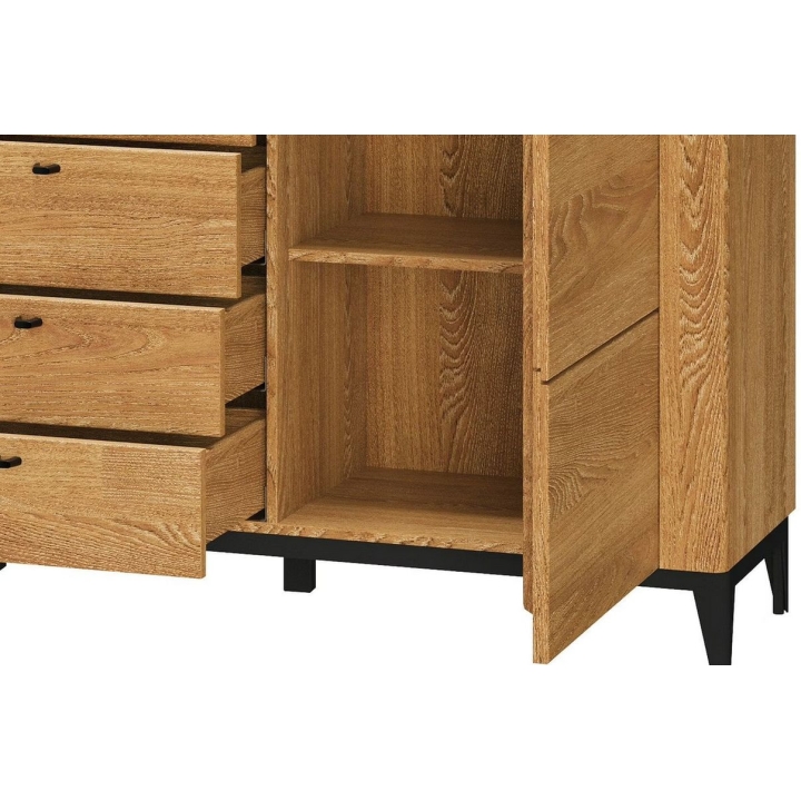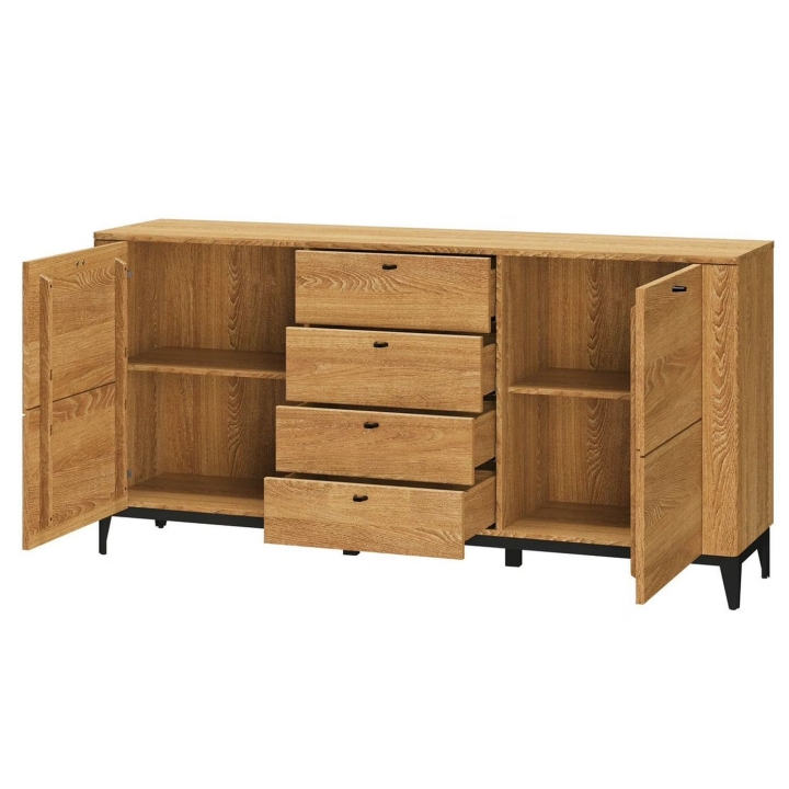 The furniture consists of four centrally placed drawers, which are ideal for storing clothes, documents or small accessories. On both sides there are doors with a silent closing system behind which one capacious shelf each hides, offering additional space for organisation. The tall, black metal legs and handles add lightness and modern style to the whole, while ensuring stability and comfort of use.