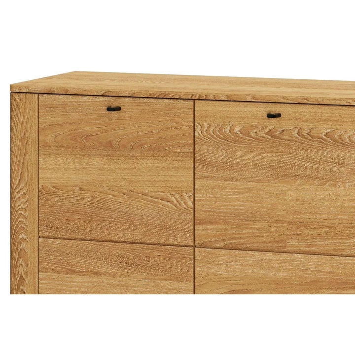 The finish of the body in oiled golden oak with black accents and the fronts in solid brushed oak give the chest of drawers a timeless style that will go well with both classic and modern settings. The solid top of the chest of drawers will be perfect as a place for decorations, family photos or a lamp, which will emphasise the unique atmosphere of the interior.