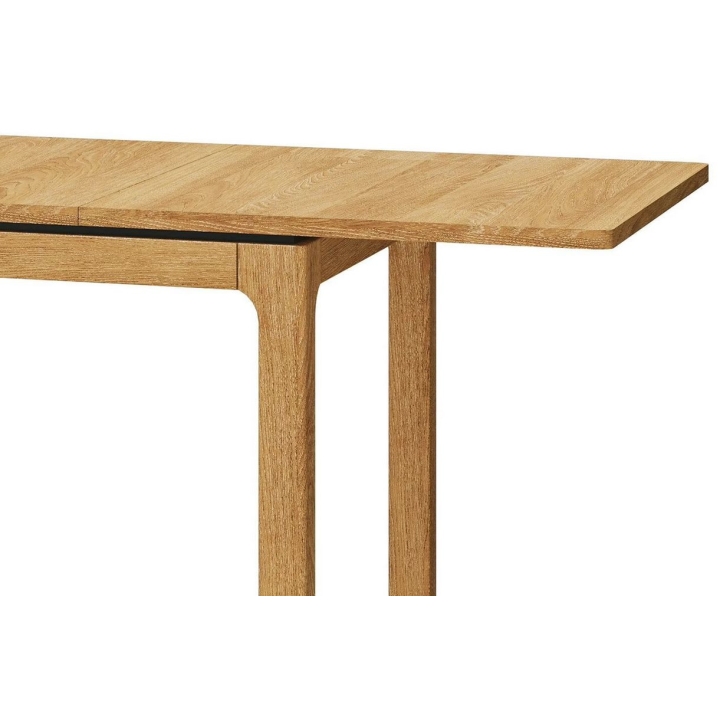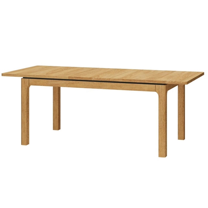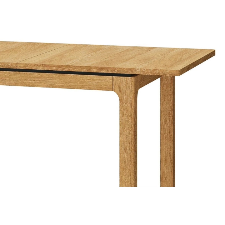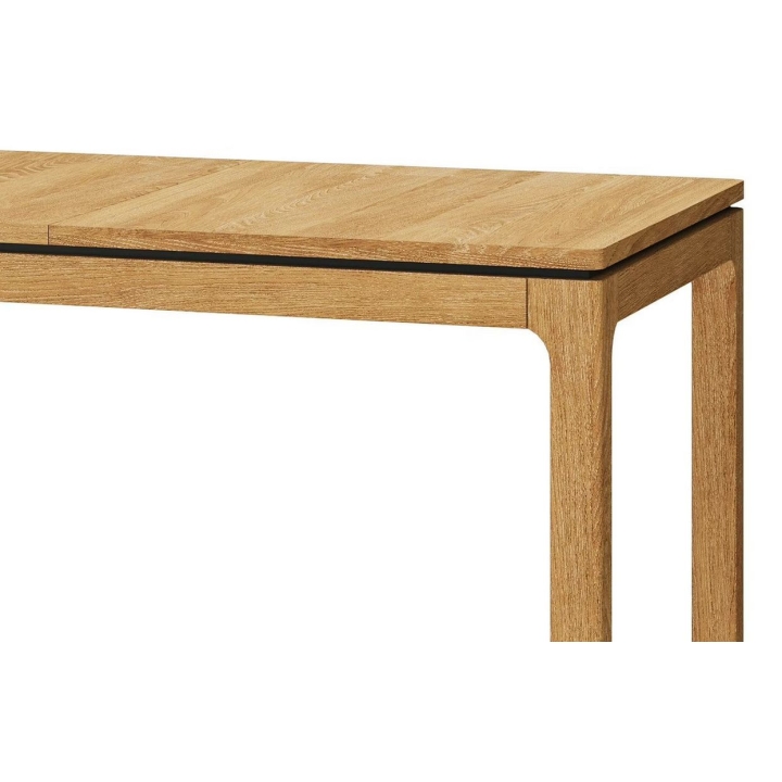 The top is made of natural oak veneer in golden oak with a black insert, while the legs are made of solid oak in the same shade. The table exudes warmth and cosiness, blending perfectly with a variety of interior arrangements. The solid construction and sturdy legs ensure durability and strength, so the piece of furniture will last for years. The minimalist design makes the table fit into both modern and classic styles.