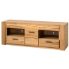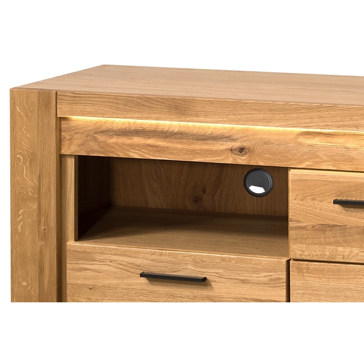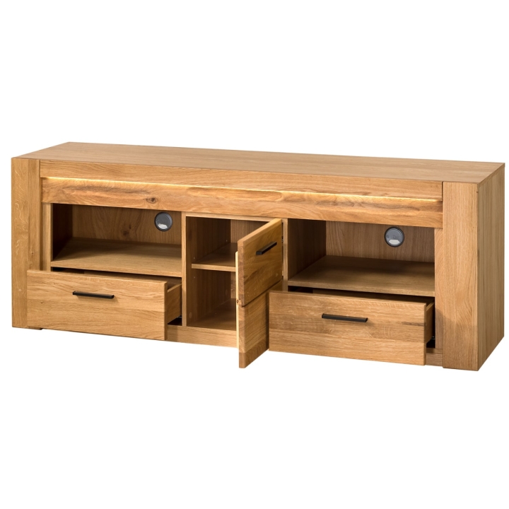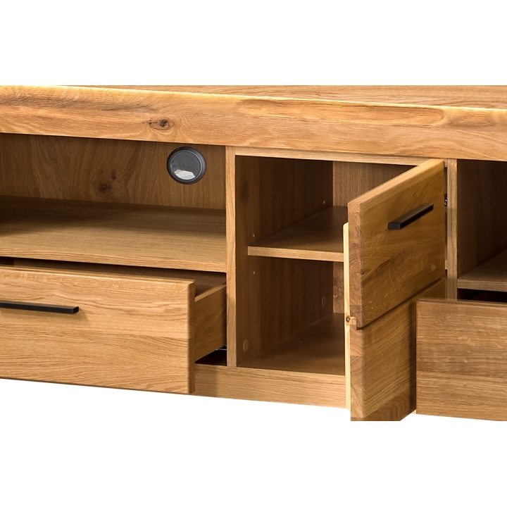 The RTV cabinet has been carefully crafted from solid oak wood and veneered furniture board, which emphasises its noble appearance and durability. The built-in two capacious drawers offer space for storing your most important accessories, while the four spacious shelves are perfect for home cinema equipment. The metal handles in black further enhance the natural beauty of the wood, adding a modern touch to the furniture.