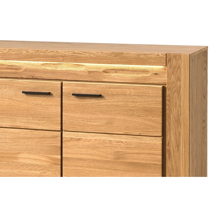 Thanks to the solid oak wood elements and the veneered furniture board finish, the chest of drawers stands out for its durability and high quality workmanship. As a standard feature, there is also an illumination of the rough-hewn wood insert which emphasises the warm colouring of the oak natura and adds a unique character to the furniture. The silent closing system ensures comfort of use and the lack of visible steps gives the chest of drawers a modern and minimalist look.