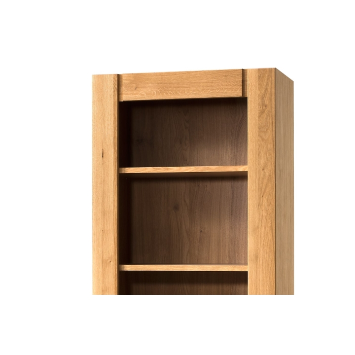 The bookcase is made of an outer veneered furniture board and an inner board in woodgrain décor, which ensures its durability and robustness. The warm colouring of the natura oak blends perfectly with a variety of interior arrangements, adding a sophisticated touch. The absence of a foot and the pedestal design give the bookcase a modern and minimalist look, emphasising its lightness and subtlety.