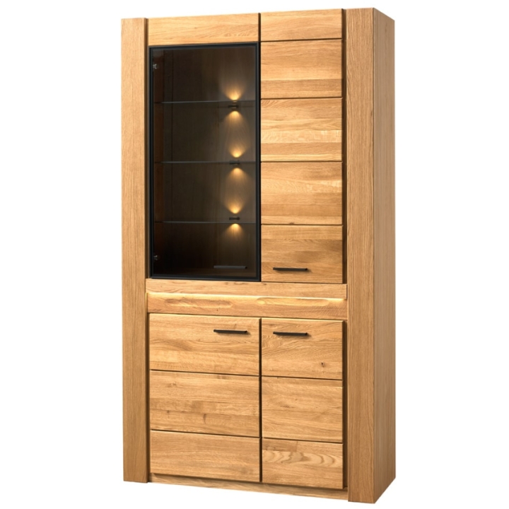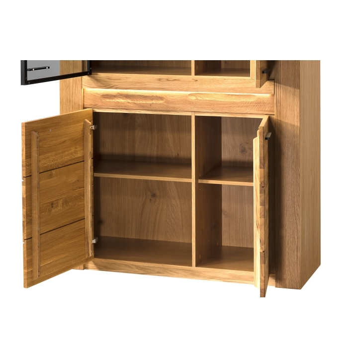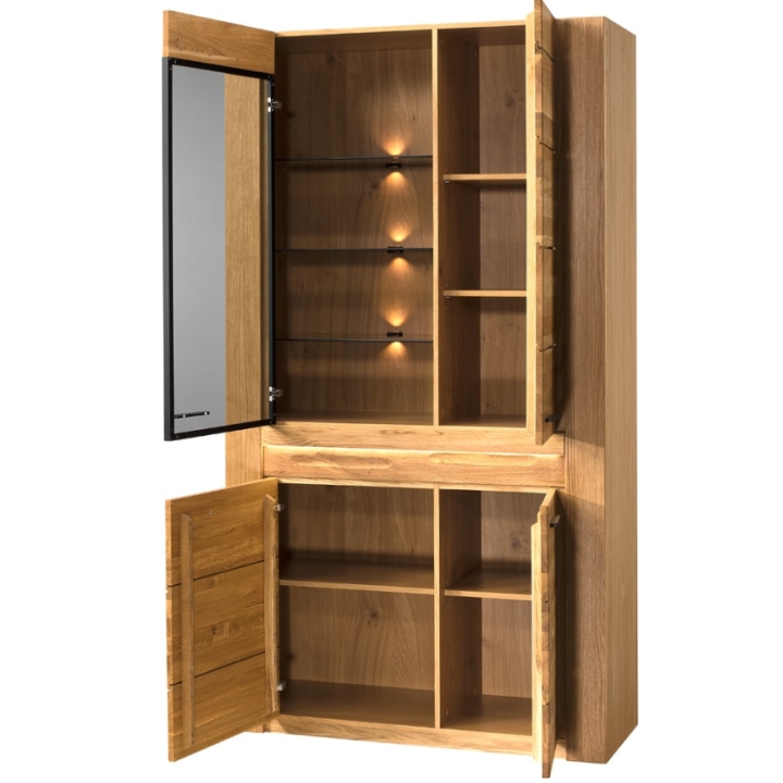 The display cabinet has been meticulously crafted from solid oak wood and veneered furniture board, ensuring its durability and high quality. The four-door design with partially glazed tempered glass fronts allows you to display your favourite decorations while offering practical storage solutions.