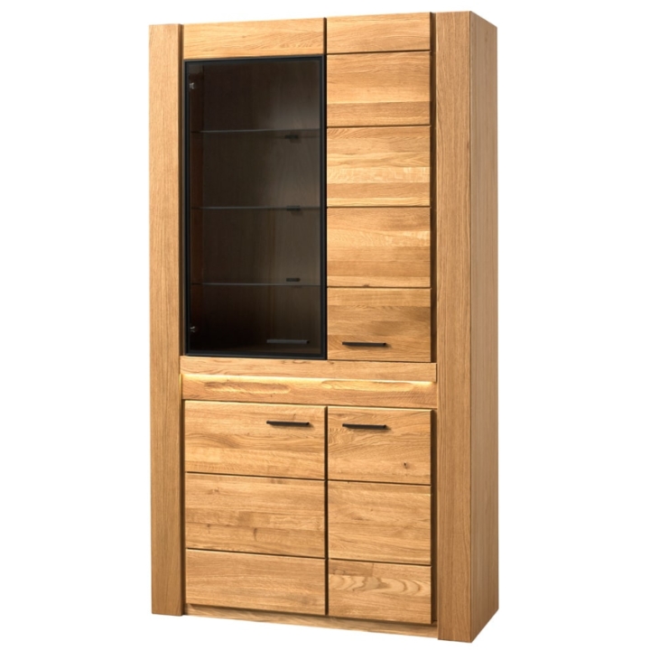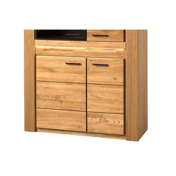 The Velvet Natura Type 12 display cabinet is distinguished by its noble oak natura décor and distinctive illuminated inset of rough solid wood, which emphasises its natural beauty and adds a unique character to the interior. Metal handles in black and optional LED lighting of the shelves ( 3xDOSL2D-CZ-BC-WN ) further enrich the aesthetics of the furniture, making it an excellent choice for those who appreciate impeccable presence and quality.