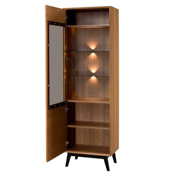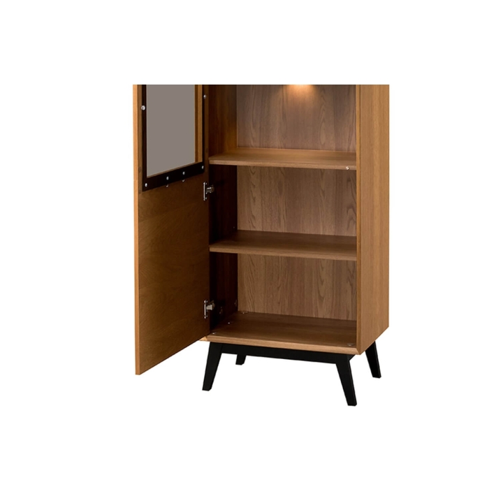 The structure of the display cabinet is made of a board with a natural oak veneer, whose warm shade - rustic caramel - blends perfectly with modern and classic interiors. The inner side of the display cabinet, which has been finished with a foiled furniture board, adds to its durability.