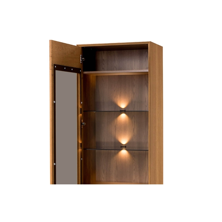 The display is fitted with LED lighting as standard,which gives it a warm and cosy feel. The lighting mounted on the glass shelves allows subtle illumination of the stored items, emphasising their aesthetic qualities. The colour of the light creates a unique atmosphere in the room.