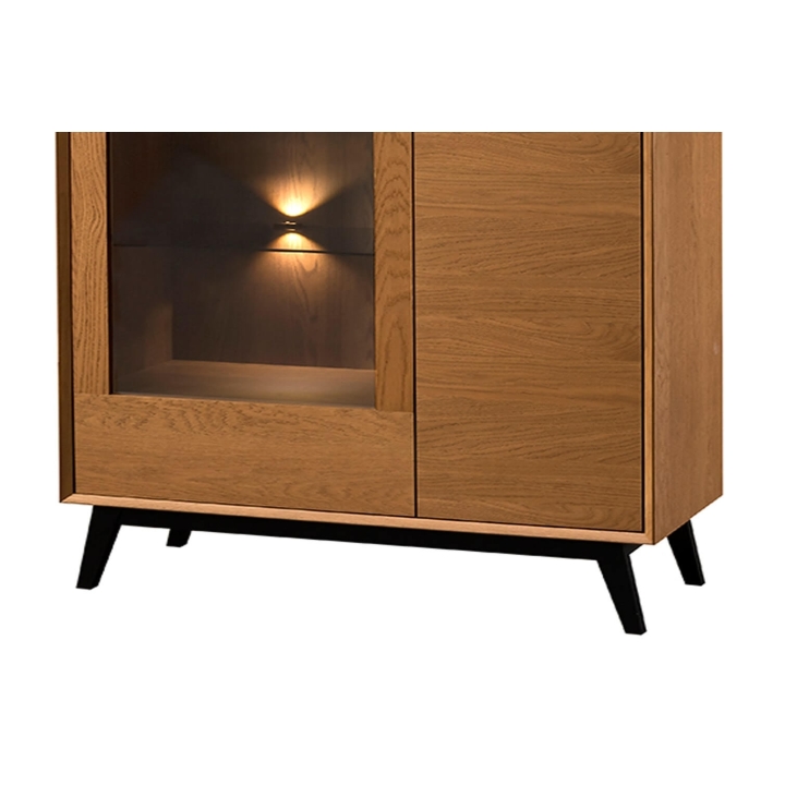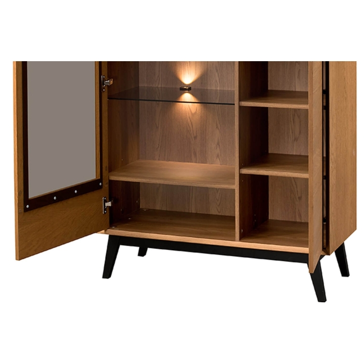 The furniture is equipped with metal handles and legs in black, which contrast with the warm shade of wood, adding a modern touch to the display cabinet. The cabinet doors are mounted on side hinges, allowing them to be easily opened and closed. The soft-close system means that the doors close smoothly without loud noises, adding to the comfort of use.