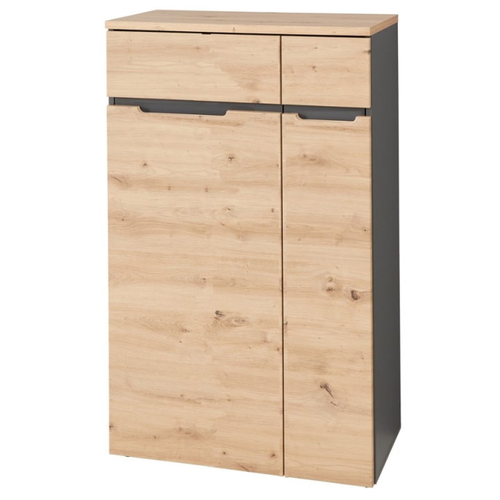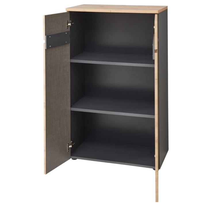 The product has been made from high-quality MDF and laminated board, making it durable and resistant to everyday use. Covering the furniture with PVC material in oak artisan colour ensures that it is not only scratch-resistant, but also easy to keep clean. The colour scheme of the cabinet is a combination of a warm shade of wood with contrasting graphite details that give it a subtle character. This combination makes the piece of furniture versatile and will effortlessly blend in with different office styles.