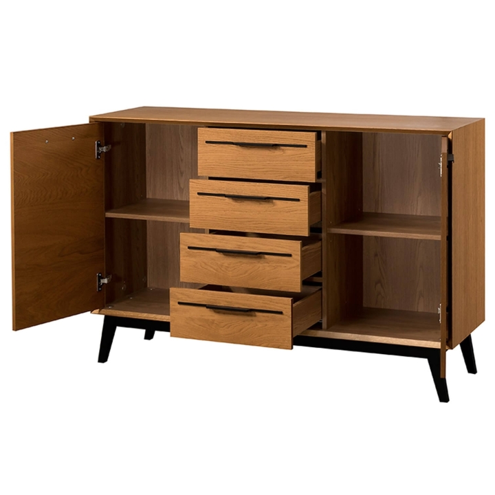 The 2-door chest of drawers with 4 drawers from the Lazure collection is a piece of furniture measuring 136 cm wide, 90 cm high and 42 cm deep, made of natural oak veneer in rustical caramel with a lacquered finish. With roomy drawers and full doors behind which shelves are concealed, the chest offers plenty of storage space while maintaining a slim, modern profile.