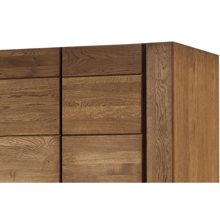 The front of the wardrobe is made of solid oak wood with roughened elements, which emphasises the natural texture and uniqueness of the wood. In addition, a furniture board with natural oak veneer on the outside was used, which guarantees the durability and solidity of the construction. The champagne-coloured metal handles harmonise with the aluminium frames, giving the whole a consistent, modern character. The wardrobe has also been fitted with a quiet closing mechanism to enhance comfort.