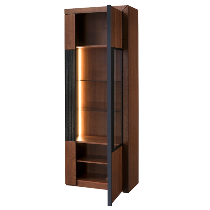 The outer body is made of veneered furniture board, and the inner body is made in a woodgrain décor, which ensures the durability and solidity of the construction. Hinges with a soft-closing system guarantee comfort of use, while the black finish of the front and black handles give the cabinet a distinctive look. The display cabinet is supplied assembled and ready to use.