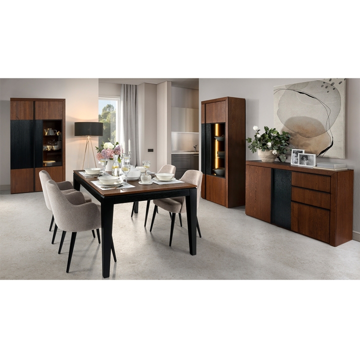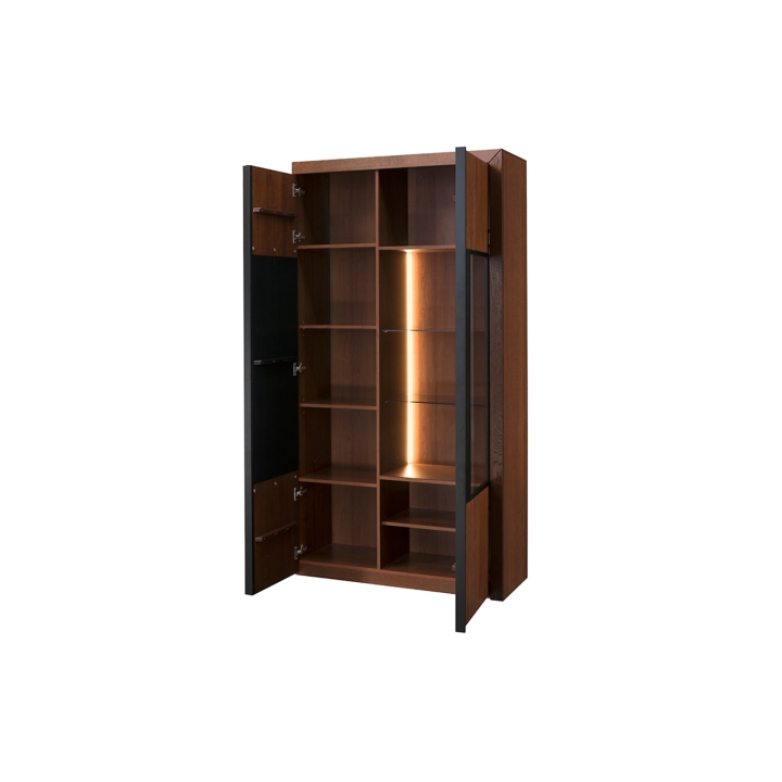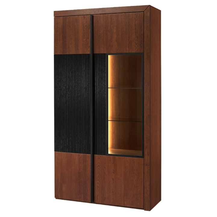 The furniture was made of durable materials - the fronts are made of solid oak and the body is made of veneered furniture board. An additional advantage of the display cabinet is the LED lighting as standard emitting warm white light, which highlights the displayed objects and creates a cosy atmosphere.
