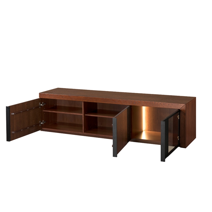 The furniture is delivered assembled, ready to use immediately after delivery. Lighting is included as standard, highlighting the details and giving the interior a cosy atmosphere. The minimalist design and the combination of warm wood tones with contrasting black milled elements and handles fits in perfectly with modern interior trends.