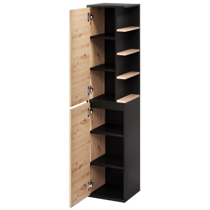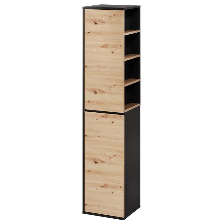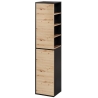 The Mossa Type 70 hanging cabinet by Szynaka Meble is a unique bathroom furniture with a width of 35 cm, a depth of 33 cm and a height of 160 cm, perfectly matching contemporary interiors. The entire piece is maintained in the colour scheme of light oak (artisan oak) and black, which gives it a fresh and close to nature look that perfectly suits bright bathrooms.