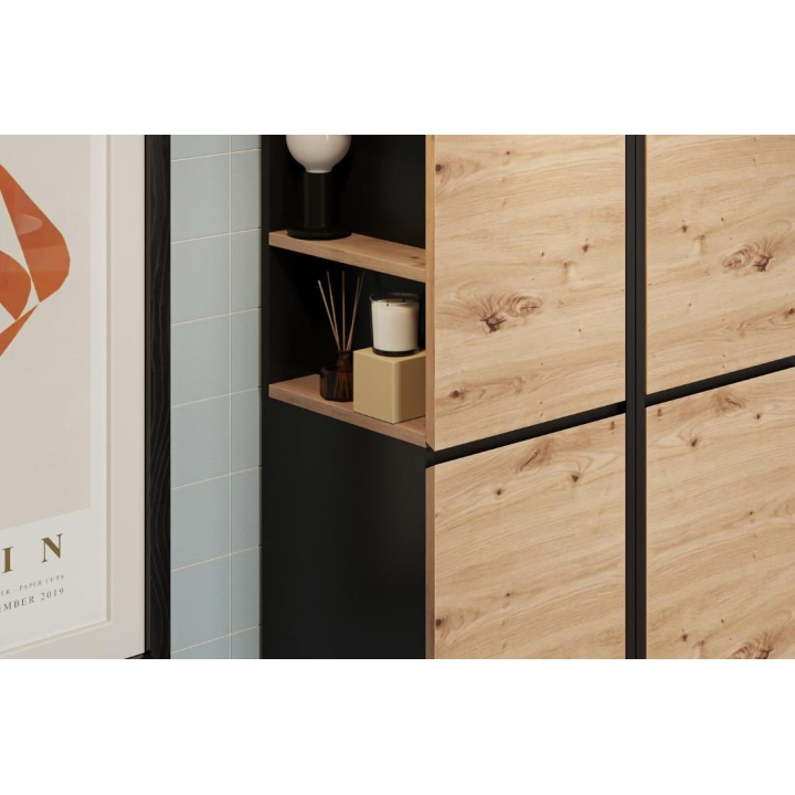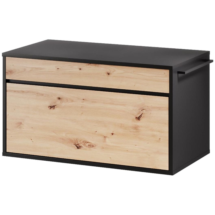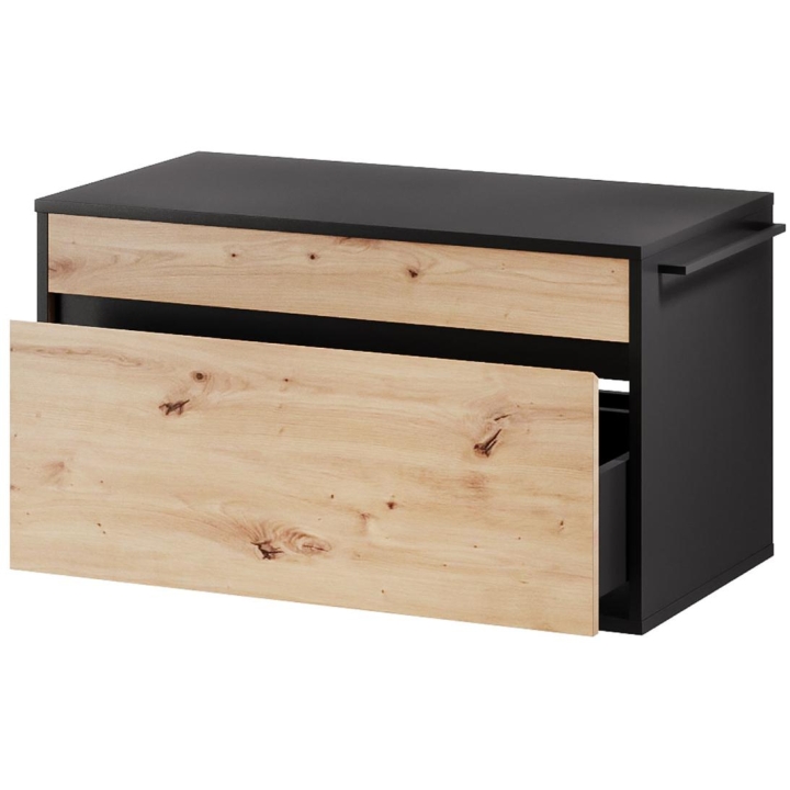 The Mossa Type 56 washbasin cabinet from the Szynaka Meble manufacturer is an exceptional bathroom furniture with a width of 80 cm, a depth of 43 cm and a height of 45 cm, perfectly matching contemporary interiors. The entire piece is maintained in the colour scheme of light oak (artisan oak) and black, which gives it a fresh and close to nature look that fits perfectly in bright bathrooms.