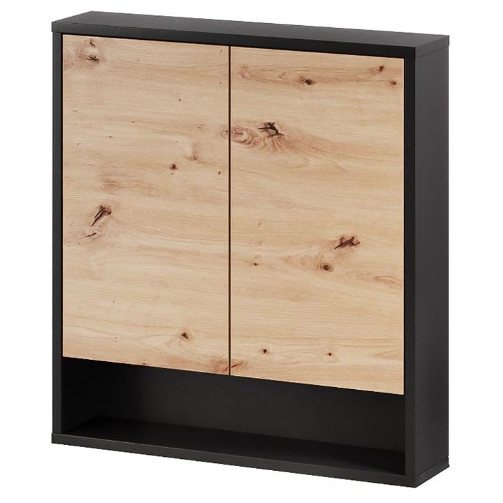 The Mossa Type 72 hanging cabinet from the Szynaka Meble manufacturer is a unique bathroom furniture with a width of 60 cm, a depth of 13 cm and a height of 80 cm, perfectly matching contemporary interiors. The entire piece is maintained in the colour scheme of light oak (artisan oak) and black, which gives it a fresh and close to nature look that perfectly suits bright bathrooms.