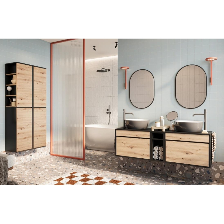 The body is made of laminated board, which will ensure durability for years to come. The furniture contains two separate niches - one larger and one smaller offering storage space for essential bathroom accessories. One internal shelf makes the interior of the bookcase more practical. It can be used to combine two washbasin cabinets to create a coherent composition.