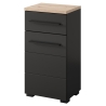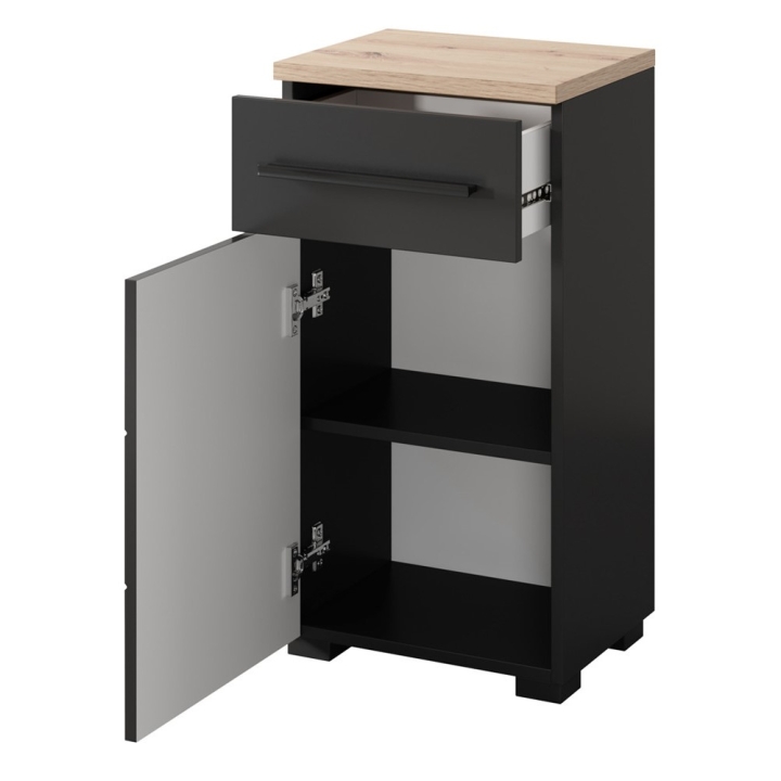 The Swing Type 45 cabinet by Szynaka Meble is a compact bathroom piece of furniture that will be perfect for smaller spaces. The modern, industrial style of the cabinet combines matte black fronts and body with a top in oak artisan colour, giving the interior a distinct character. The piece of furniture is equipped with one door (with universal mounting - it can be installed on both the right and left side) and one drawer, which allows for convenient storage of both cosmetics and other bathroom accessories.