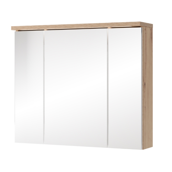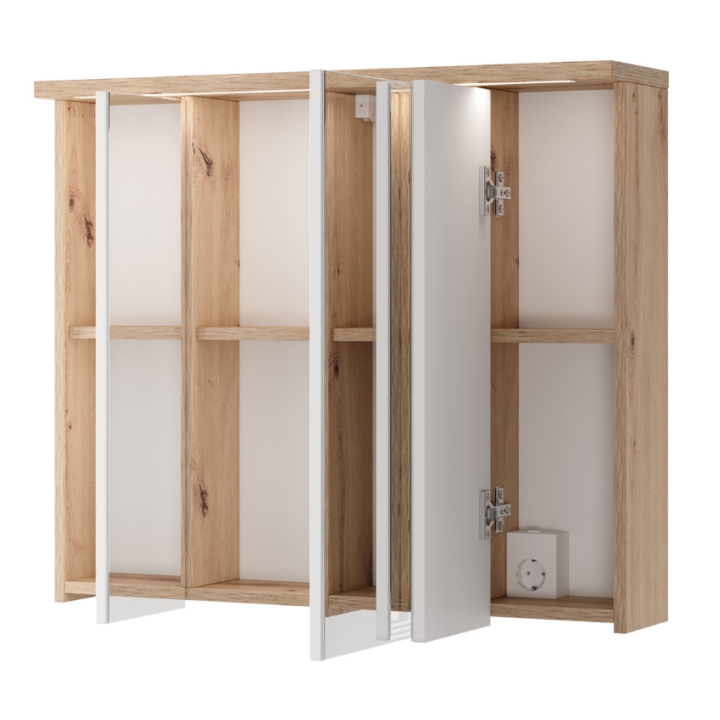 Cabinet with mirror and lighting Sting Type 58 by Szynaka Meble with dimensions: 80 cm wide, 69 cm high and 20 cm deep, presents a balanced form and carefully refined details. Smooth, symmetrical fronts with a mirror give the furniture a modern look. The combination of the mirror with the warm shade of artisan oak, creating a balanced visual composition that suits contemporary interiors.