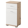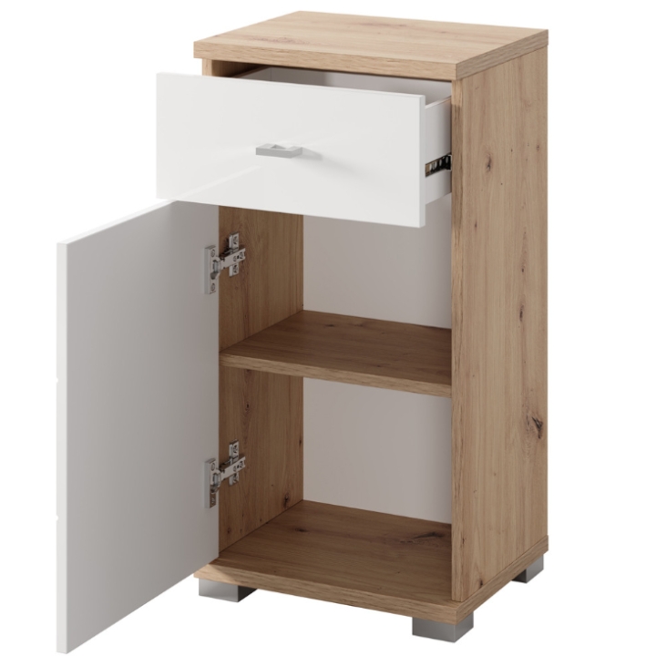 The cabinet has been designed with the convenience of everyday use in mind. It is equipped with one door (with universal L/P assembly) and one drawer, which provides sufficient space for storing small items. The front is made of MDF furniture board covered with PVC foil and the body is made of furniture board. The chrome handles, carefully integrated into the design, introduce a modern touch, emphasising the aesthetics and quality of the finish.