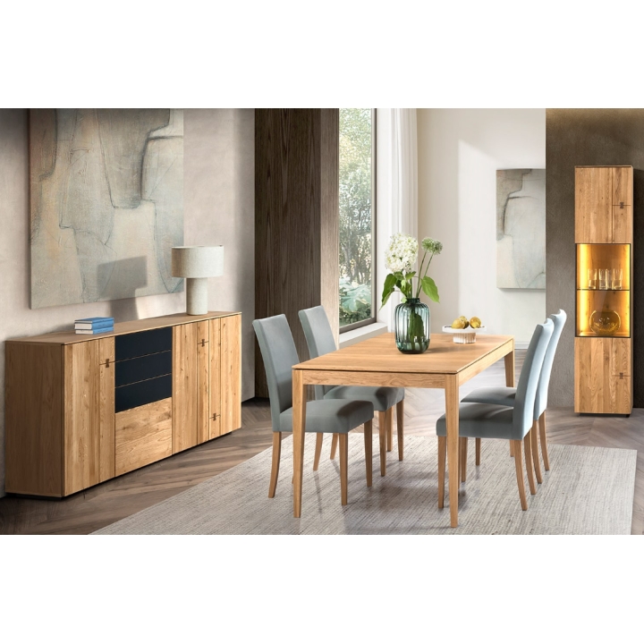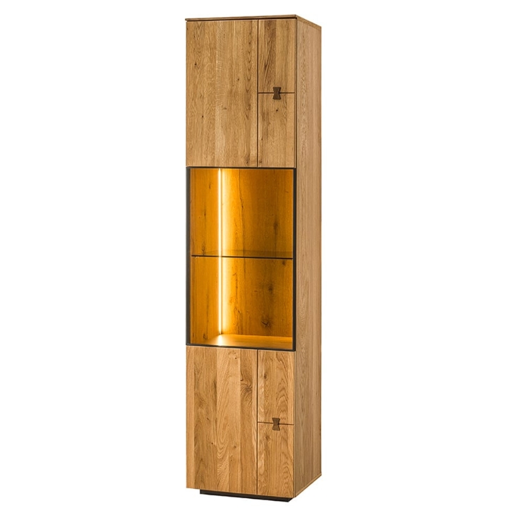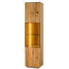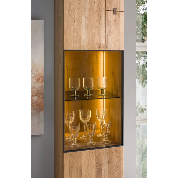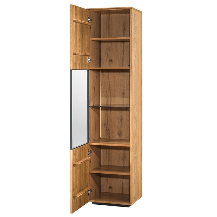 The entire unit measures 45 cm wide, 198 cm high and 40 cm deep, ensuring harmonious proportions and adequate capacity. The single-wing door has a partially glazed front, allowing for a subtle presentation of items. In the center there is a glass shelf with LED lighting, which in this model is included in the basic equipment.