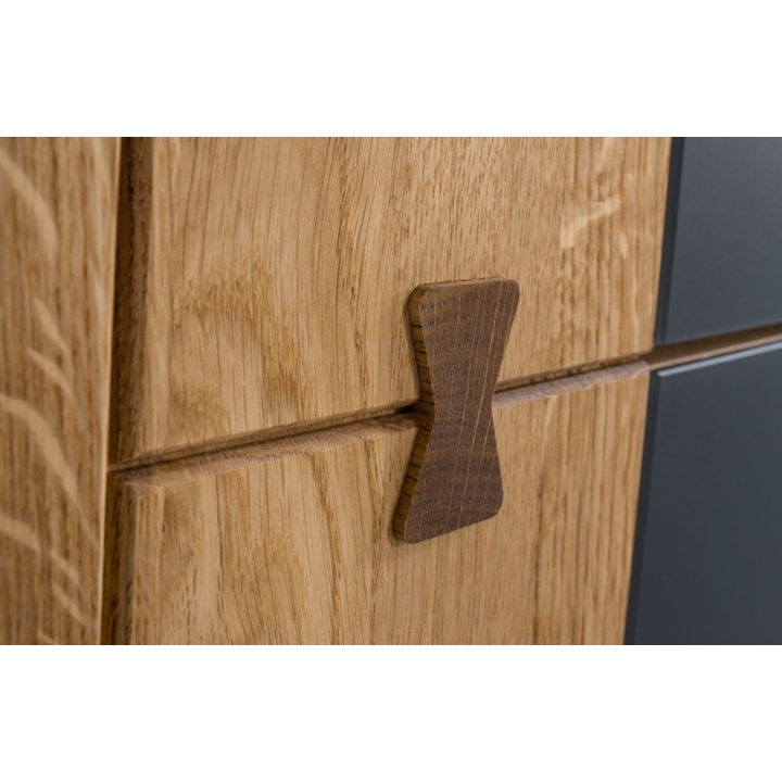 The front was made of solid oak wood, emphasizing the durability and solidity of workmanship. The body is made of furniture board finished with natural oak veneer, and the interior is made of board in woodgrain decor, which guarantees a consistent effect. The design also provides for mounting to the wall, which further increases stability and safety of use.