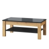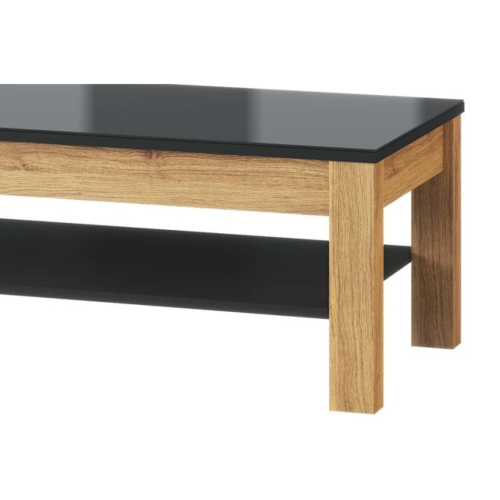 The table is made of furniture board foiled in a woodgrain décor with a black glass top for durability and easy care. It has a spacious black shelf under the top, which provides additional storage space for small items, books or decorations. Thanks to its simple but aesthetically pleasing design, the table fits perfectly into a variety of arrangements, working perfectly with other interior furnishings.