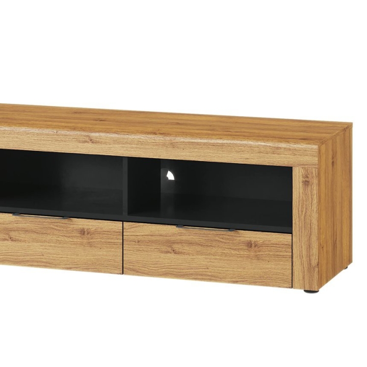 The cabinet is equipped with two drawers that provide ample space for storing small items, as well as cable slots to organise the media space. In addition, black round feet and black handles complete its modern look. The furniture has been designed with simplicity and comfort for everyday use in mind.