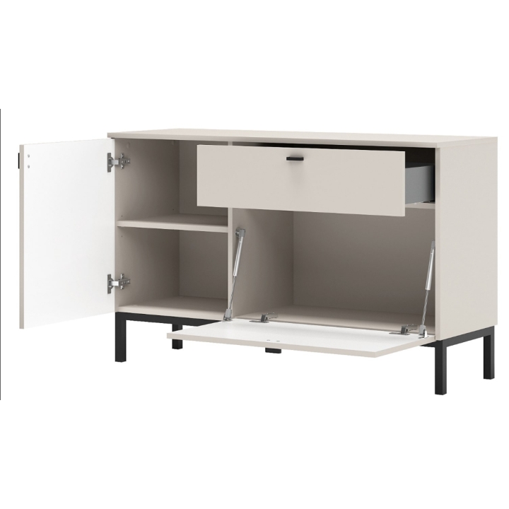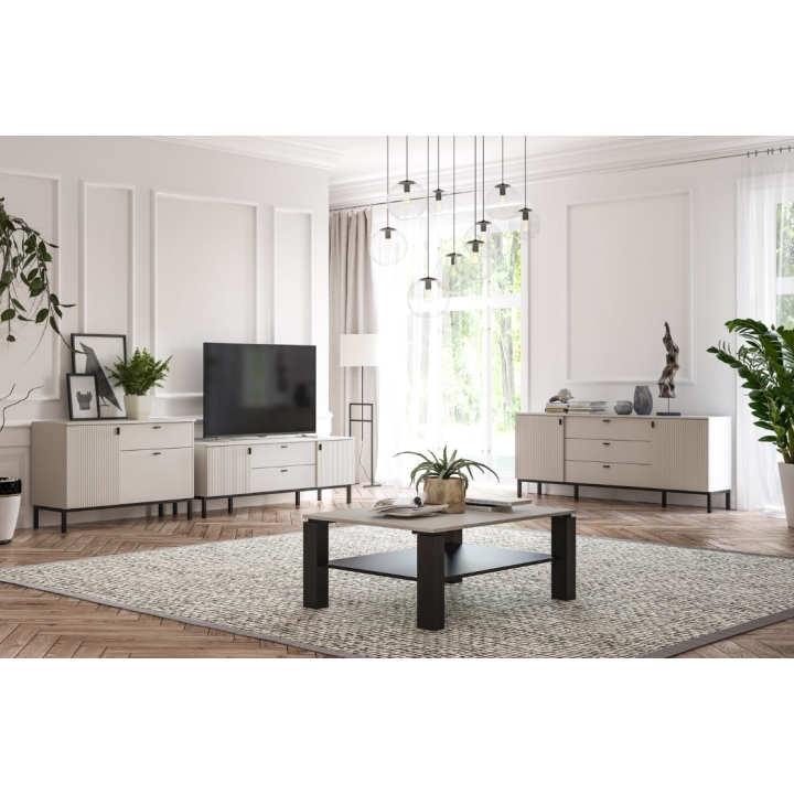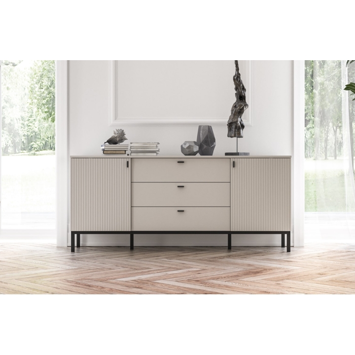Designed with carefully balanced proportions, the sideboard embodies a modern and well-composed aesthetic. Its body is crafted from foil-coated and laminated furniture board, ensuring durability and resistance to daily wear. The front panels, made of the same material with an addition of MDF PVC, lend the piece a touch of sophistication and depth.