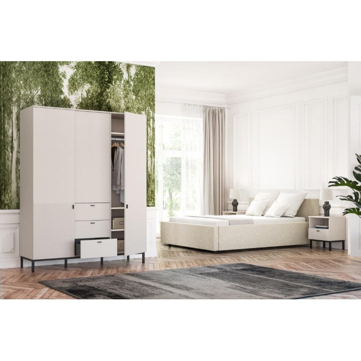 The Szynaka Meble Korfu 01 sideboard impresses with its refined form and precisely crafted details. Finished in a cashmere color, it exudes a light and neutral appearance, making it a perfect addition to various interior settings. The high black legs give the piece a sense of visual lightness, while the black handles add a subtle contrast that enhances its contemporary character.