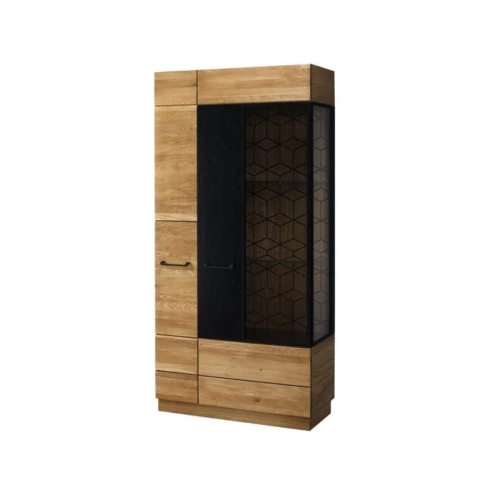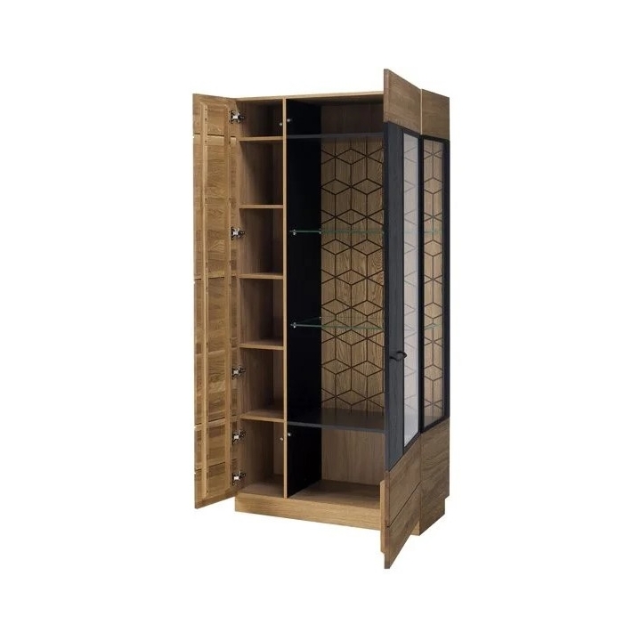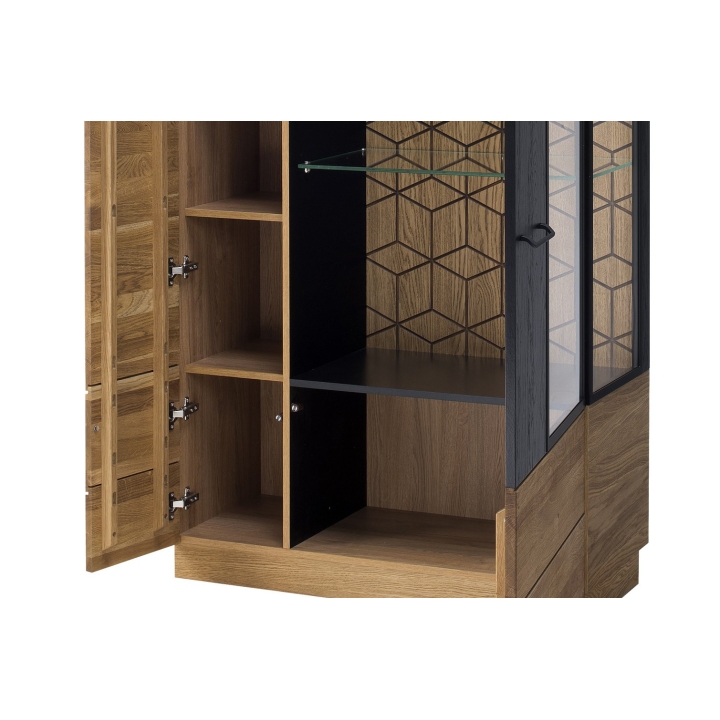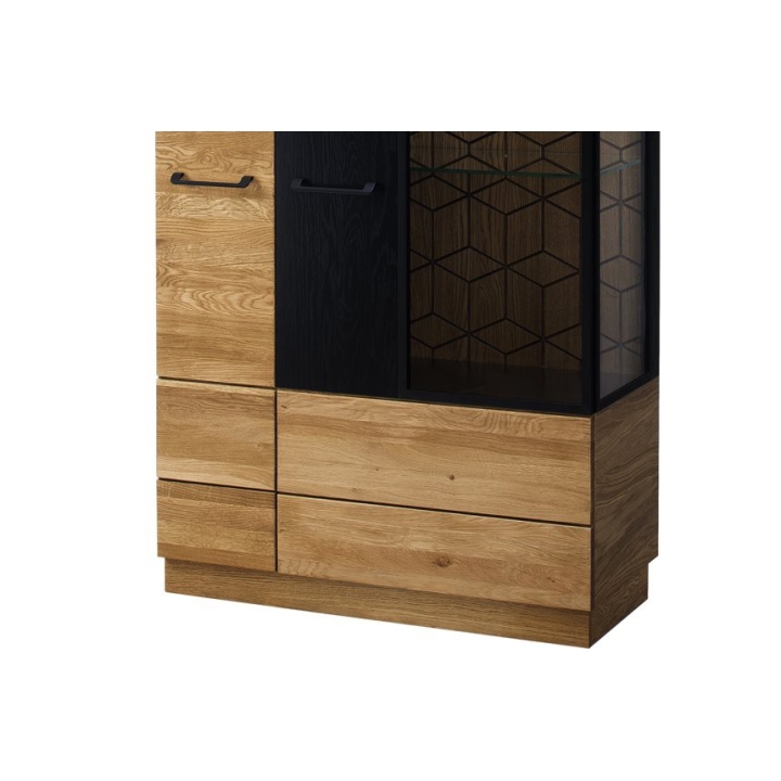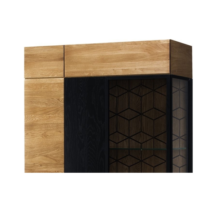 The solid construction of the display cabinet is thanks to high-quality materials such as solid oak wood and board in natural oak veneer. Glass elements, including toughened glass on the front, guarantee durability and safety. With the option of fitting optional LED lighting, the contents of the display case can be further highlighted, creating a warm and cosy atmosphere in the room. The lighting kits available are: 3-L-BN-2-0000-01, 3-L-BC-2-0100-01, 3-L-BC-2-0400-02 or 4-L-WL-6-0000-01, which harmonise perfectly with the modern design of the furniture.