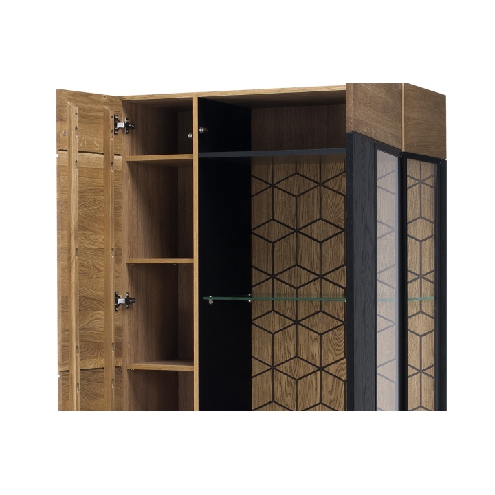 The Mosaic collection is a harmonious combination of the warm shade of honey oak with black matt and subtle decorative milling in hexagons. Such a contrast gives the furniture a modern character while emphasising the natural beauty of the wood. The handle made of black metal was matched to the aluminium frame, which emphasises the coherence of the design.