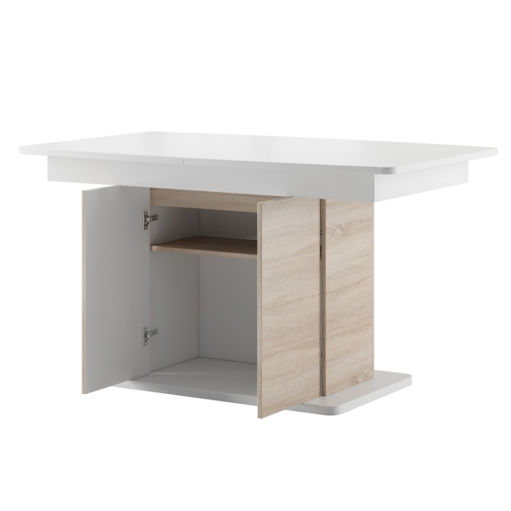 Thanks to the use of two inserts hidden under the top, the table extends from 140 cm to 210 cm, which allows comfortable use by a larger number of people. A unique feature of the model is the solid leg construction, which includes a practical cupboard with a push-to-open shelf, ideal for storing essential accessories.