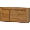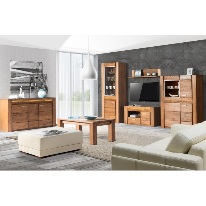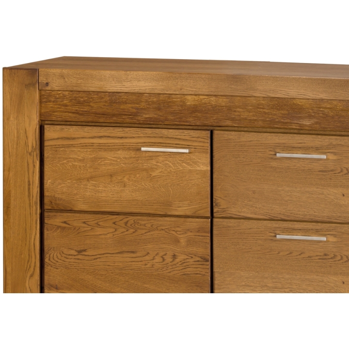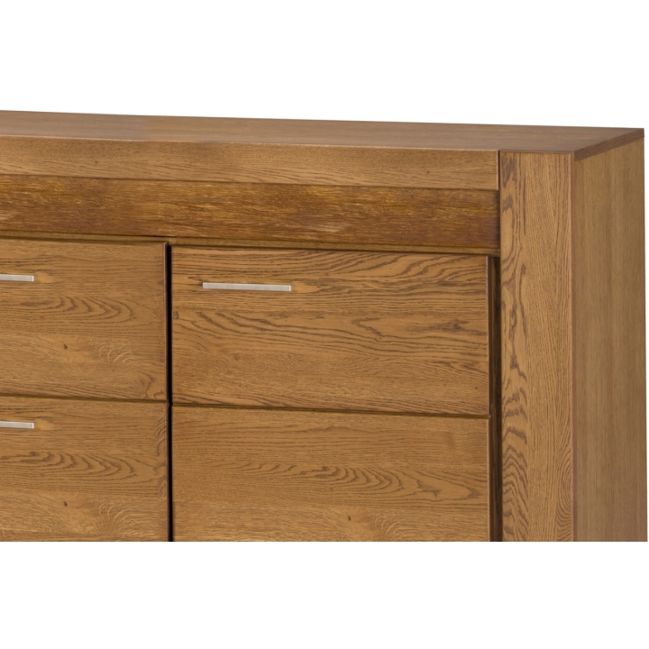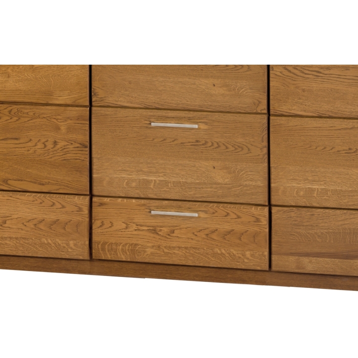 A distinctive feature of this collection is the rough-hewn decorative inset highlighted as standard with natural imperfections such as knots and rubbing, giving it a unique and sophisticated style. The car cass made of furniture board in natural oak veneer and solid oak fronts emphasise the durability and solidity of the furniture. The champagne-coloured metal handle adds a modern touch. The rustic oak colouring warms up the interior, introducing a cosy atmosphere. The chest of drawers is durable and solid, with a maximum load capacity of 15 kg, and has the option to be fixed to the wall for added security. The dimensions of the chest of drawers are 181 cm wide, 88 cm high and 42 cm deep, and the piece of furniture is delivered assembled, in its original packaging. This piece is the quintessence of aesthetics and timeless style.