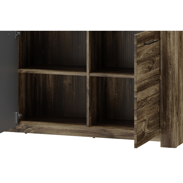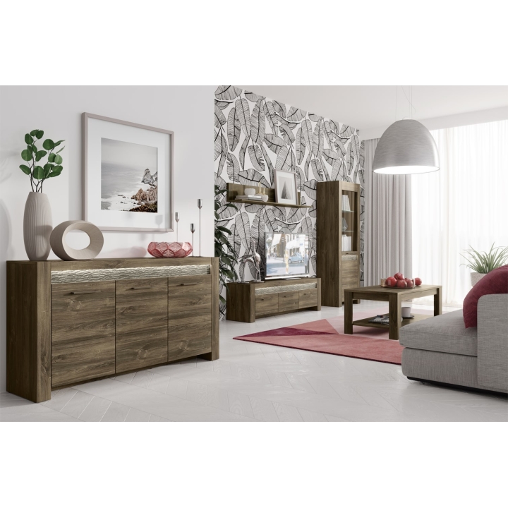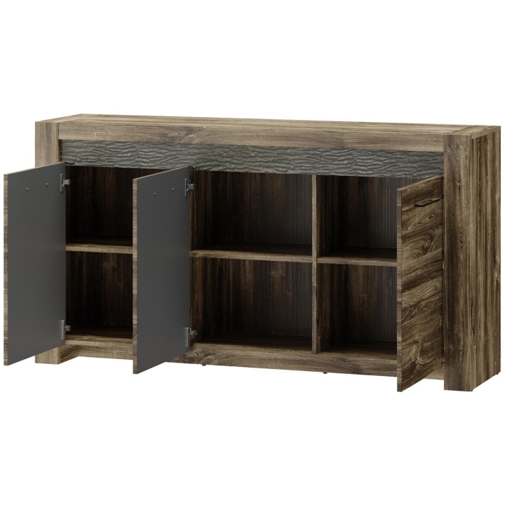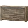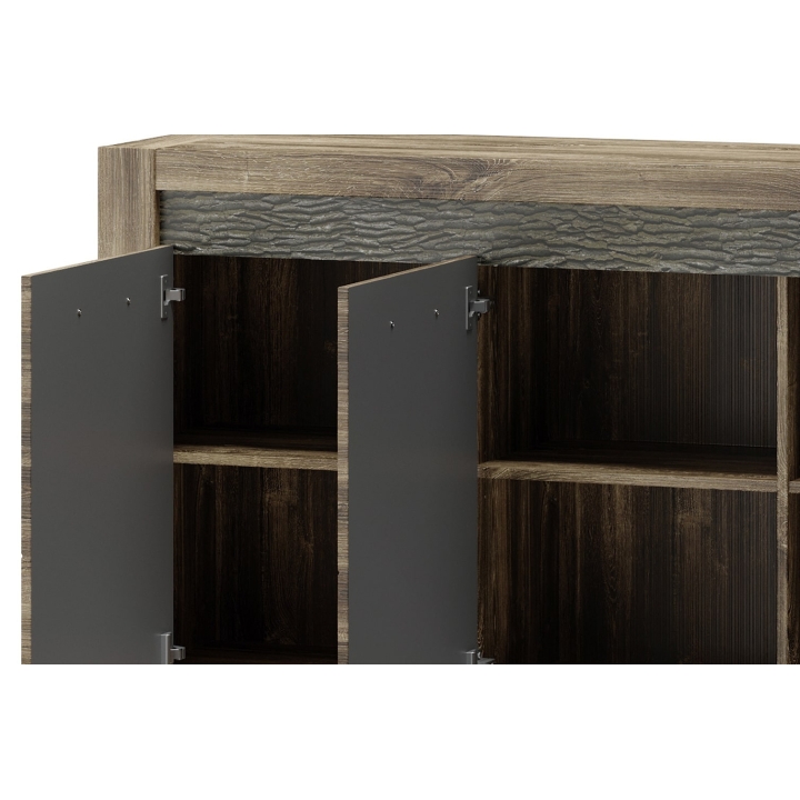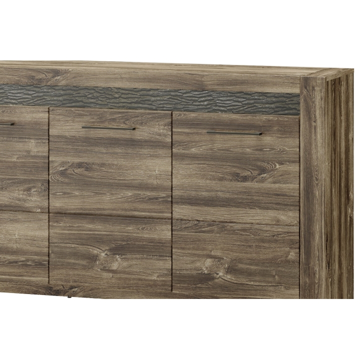 The furniture is made of high quality materials - the fronts are made of MDF covered with PVC foil in wood-like décor, while the body is made of foiled furniture board. The colour scheme of stirling oak with a subtle bark decorative element gives the chest of drawers a unique, natural character. With three full doors and six shelves, the chest of drawers offers ample storage space, while the old silver-coloured metal handles are a stylish accent that emphasises the elegance of the furniture.