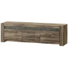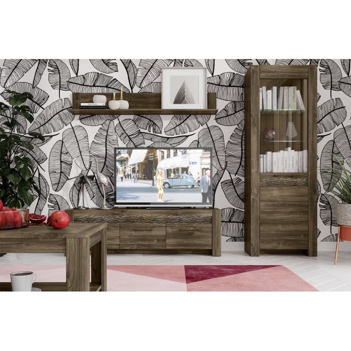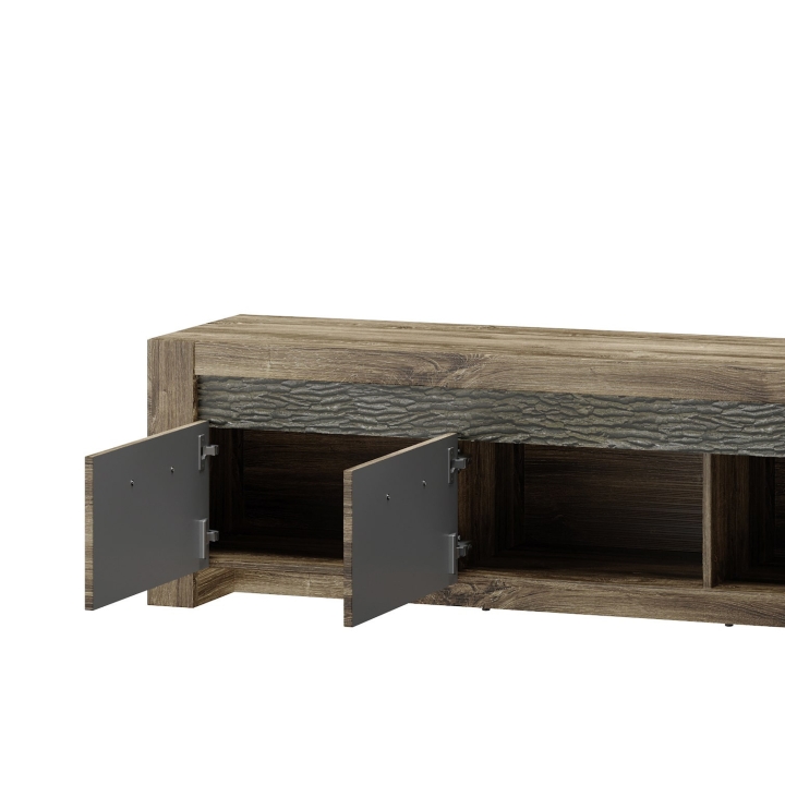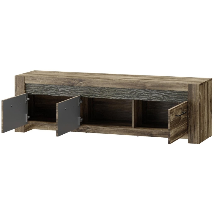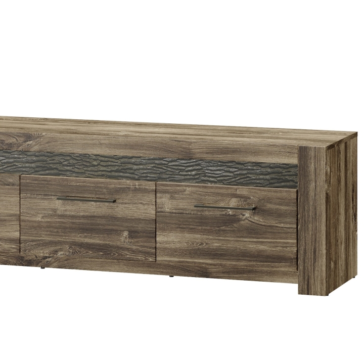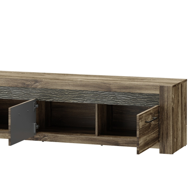 Made in the colour of oak stirling, with a decorative accent in the form of bark, the RTV cabinet stands out for its modern finish. The fronts are made of MDF veneered with PVC foil in a wood-like décor, and the body is made of foiled furniture board. With three full doors and three shelves, the cabinet offers ample storage space while remaining minimalist and aesthetically pleasing.