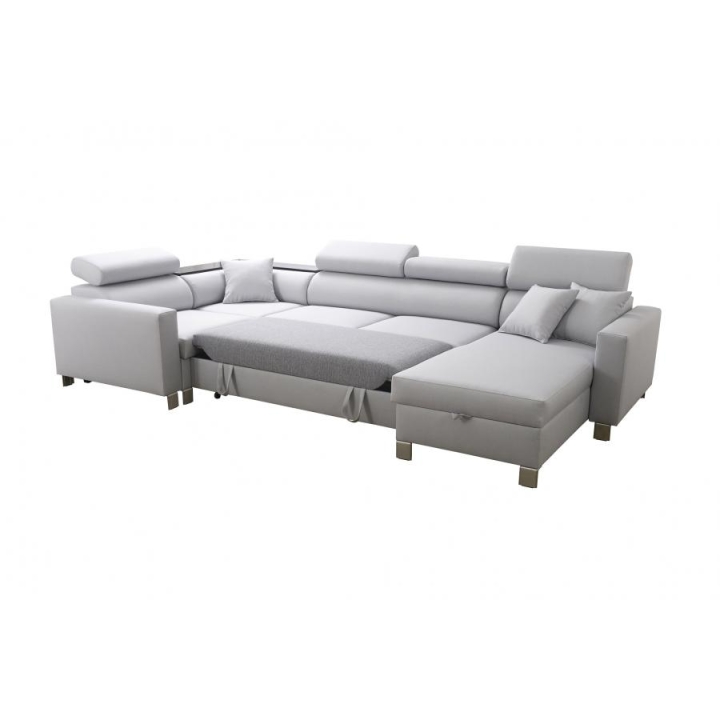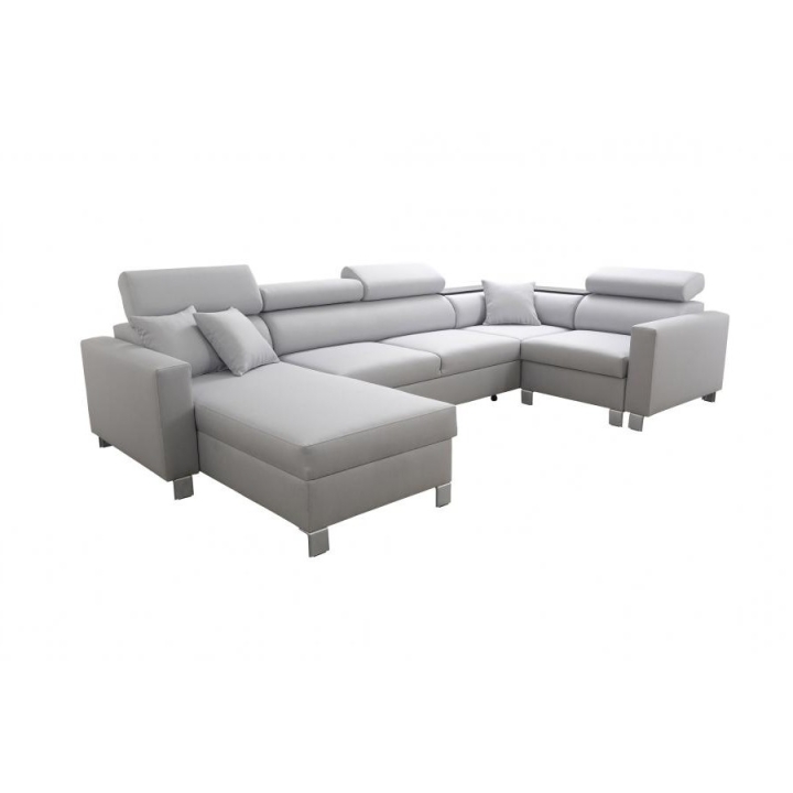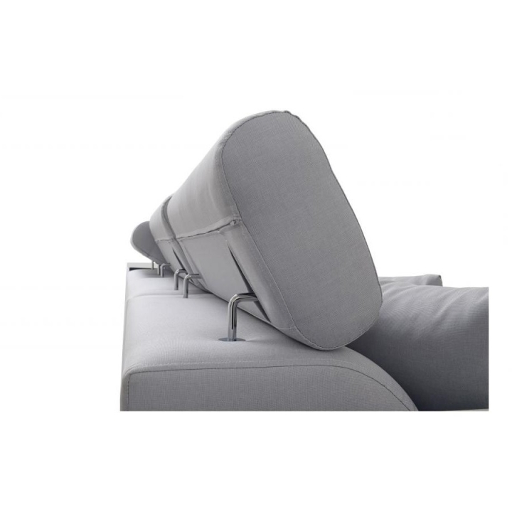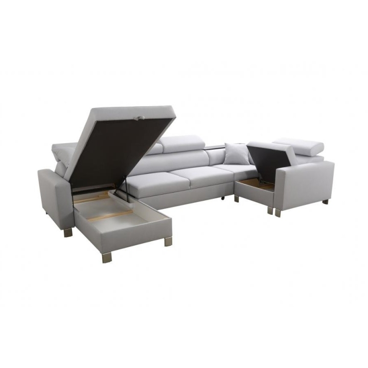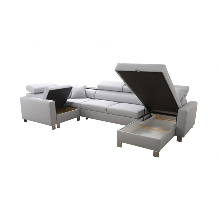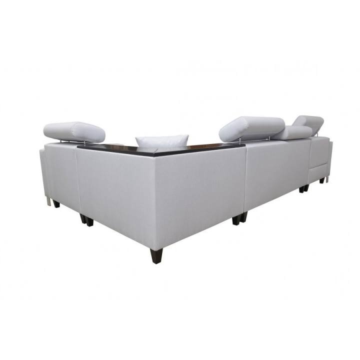 Users will appreciate the extensive features of this model, which enhance its utility. The Loretti V is equipped with 4 adjustable headrests, allowing for individual adjustment of the head support angle. An additional advantage is the two bedding containers, offering significant space for storing household textiles. The corner sofa also has a built-in shelf in the corner, serving as a spot for small items or decorations.