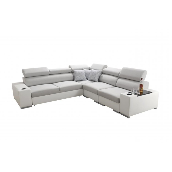 This model also features an opening bar compartment and cup holders, enhancing everyday usability. The set includes free pillows shown in the photo, completing both the visual and functional aspects of the furniture. The entire structure is based on a reinforced frame (wooden construction + chipboard), ensuring long-term stability.
