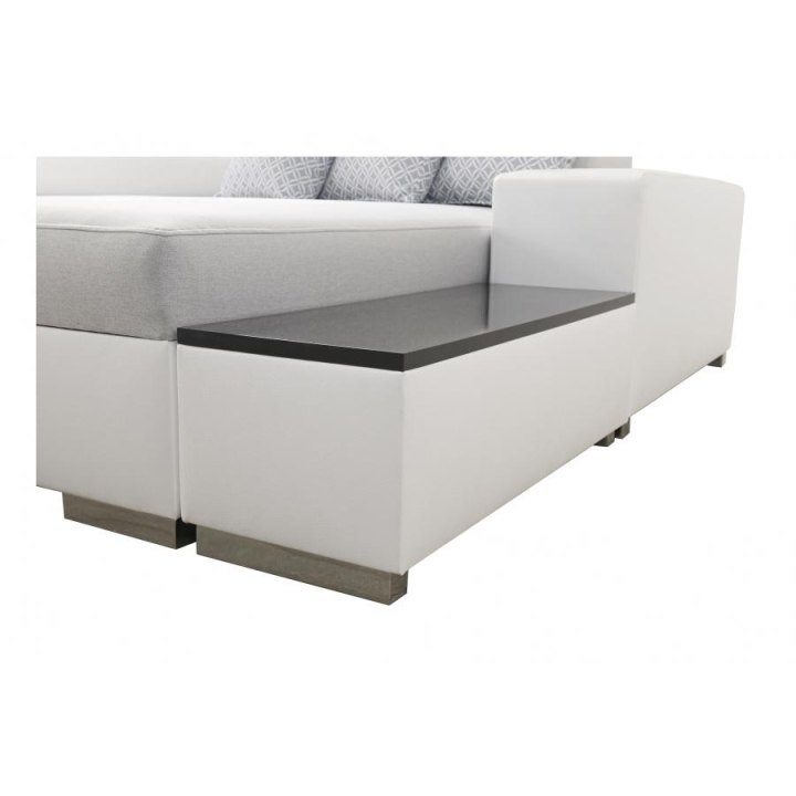 The colour range of the wooden and laminated components covers: high-gloss lacquered board (white, black), laminated board (oak Lancelot, silver venge, matte black satin), and wood (black, white, alder, beech, venge). The corner sofa may be fully upholstered in any fabric of choice. Thanks to the advanced configurator, the upholstery can be tailored to individual aesthetic preferences — dozens of fabrics with various textures, colours, and properties ensure seamless integration with the intended interior concept and offer complete visual customisation.