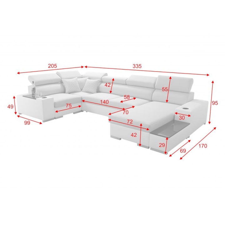 The Perseon IV Mini Umebluje corner sofa is a spacious leisure unit available in right- or left-handed configuration. Its U-shaped construction provides ample space for daily relaxation. The structure is based on a well-designed form measuring 335 cm in width, 205 cm in depth, with a 170 cm shorter side, a 205 cm longer side, and a height of 95 cm.