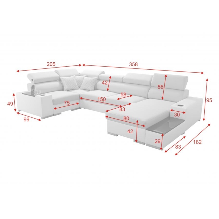 The Perseon IV Maxi Umebluje corner sofa is an extensive U-shaped model, available in both right- and left-side configurations, designed to create a relaxation area with a carefully considered structure. Its impressive width of 358 cm, depth of 205 cm, and asymmetrical side lengths — 182 cm (shorter) and 205 cm (longer) — allow it to be comfortably arranged in larger interiors. The total height of 95 cm and seat height of 42 cm ensure everyday comfort, while the sleeping surface of 284 × 127 cm provides sufficient space for nighttime rest.