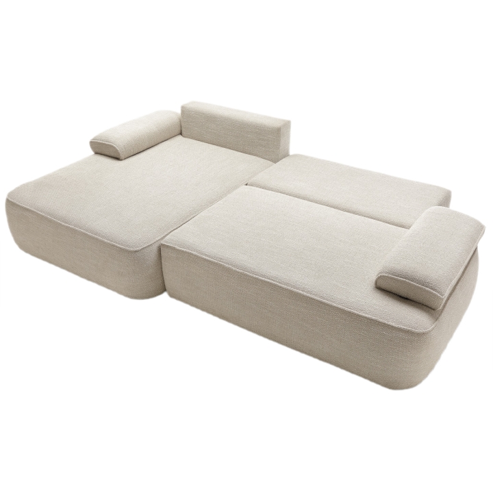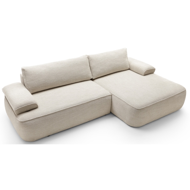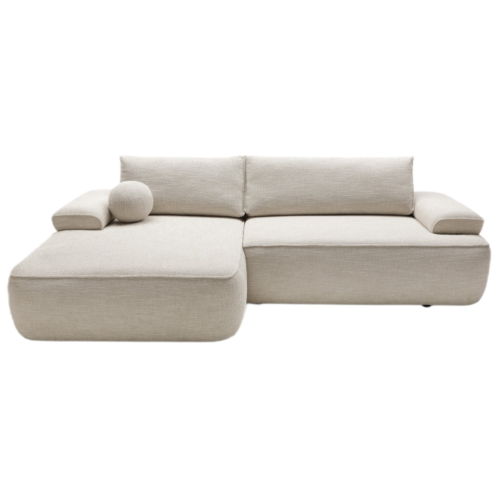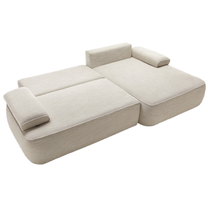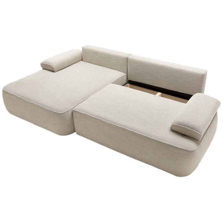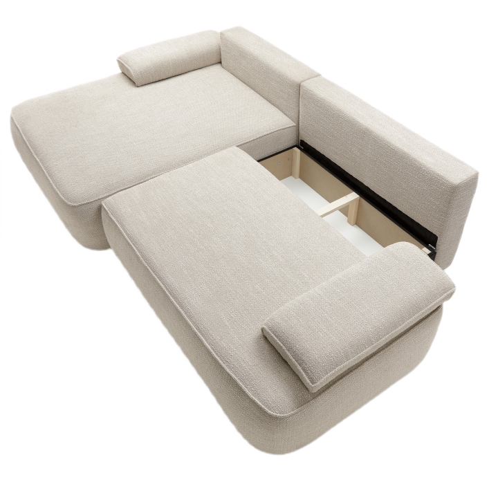 The sofa is equipped with a DL unfolding mechanism, which allows the seat to slide forward while the backrest folds down, creating a flat and comfortable sleeping surface measuring 215 × 135 cm. This solution enables a quick and effortless transformation from a sofa into a full-size sleeping area, without the need for excessive force. Additionally, the structure includes a practical bedding storage compartment, helping to keep the living space tidy and organized.