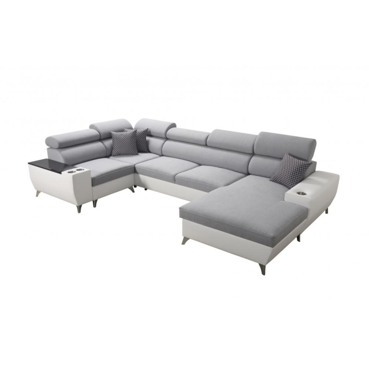 A wide range of finishing options is available, including a choice of front legs in chrome metal or black matte metal, as well as rear wooden legs in black, white, alder, wenge or beech, with chrome available at an additional cost. Customers may also select cup holders in black or silver and various shelf finishes: high-gloss lacquered laminate boards in white or black, laminate boards in oak lancelot, silver wenge or matte black satin, or solid wood in black, white, alder, beech or wenge. The corner sofa can be fully upholstered in any fabric, and thanks to an advanced configurator, the upholstery can be tailored to individual aesthetic preferences, with dozens of fabrics of different textures, colors and properties available, allowing the furniture to fit seamlessly into the intended interior concept while offering full visual personalization and high user comfort.