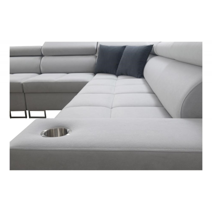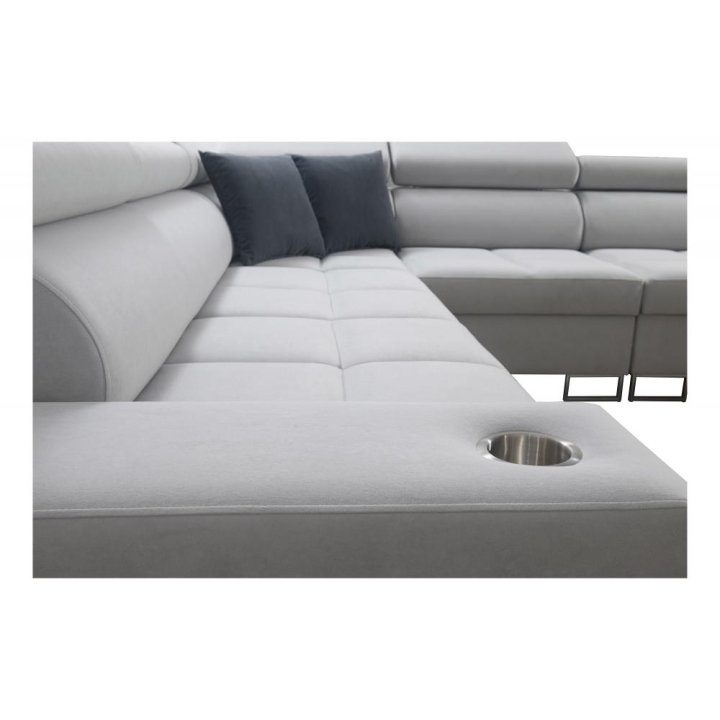 Additional finishing options include cup holders in black or silver and a wide selection of shelf color variants, such as high-gloss lacquered boards in white or black, laminated boards in oak lancelot, silver wenge or black satin matte, and wooden versions. The corner sofa can be fully upholstered in any selected fabric, and thanks to an advanced configurator, the upholstery can be tailored to individual aesthetic preferences, with dozens of textures, colors and properties available, allowing Moren III Umebluje to fit seamlessly into the intended interior concept while offering full visual personalization.