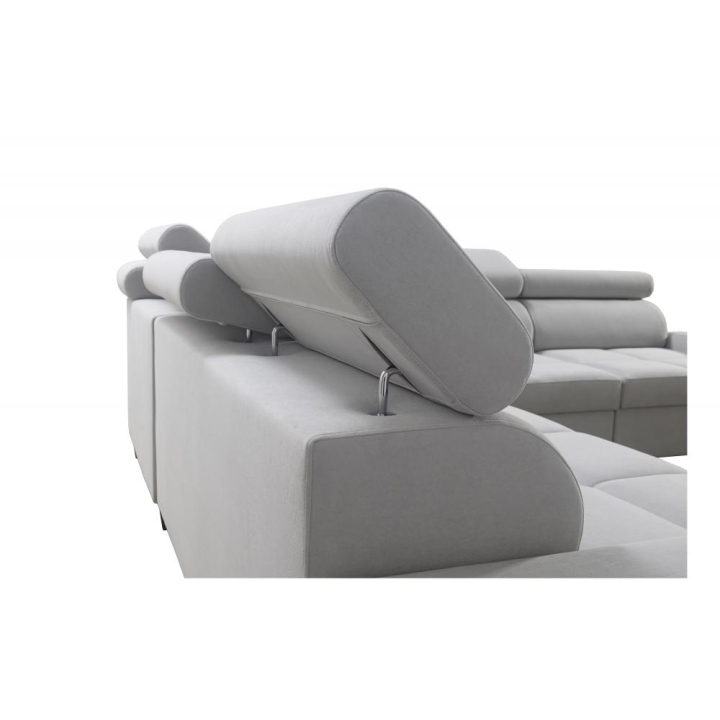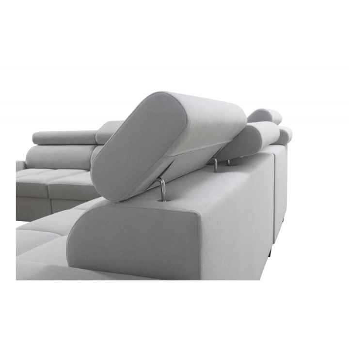 The equipment includes 6 adjustable headrests, enabling individual back support adjustment. The sofa is fitted with 2 bedding storage compartments, an opening minibar, as well as a USB port and an electrical socket, enhancing everyday convenience. Cushions visible in the photos are included free of charge, with no additional cost.