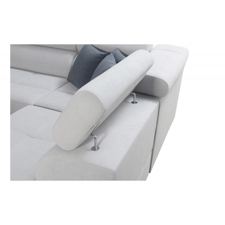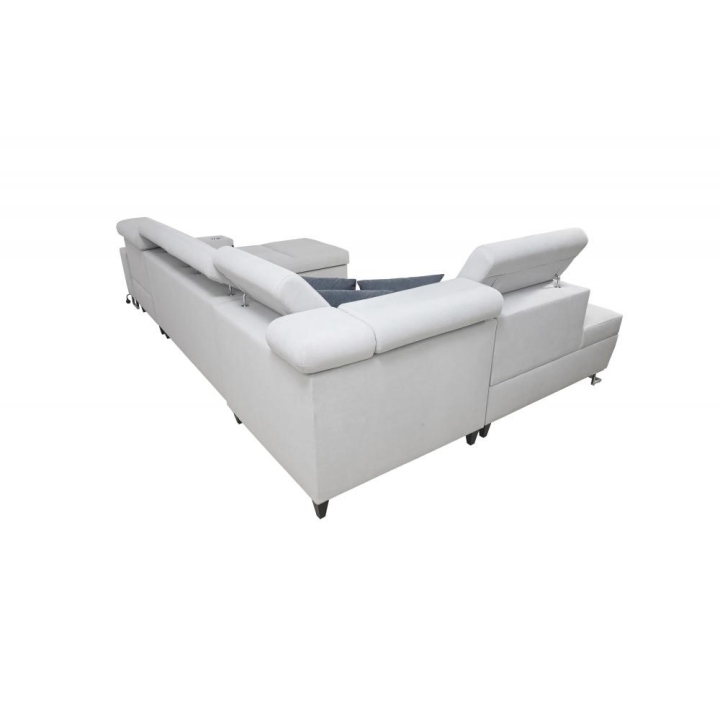 The corner sofa is equipped with 6 adjustable headrests, an opening bar, as well as a USB port and electrical socket, enhancing daily comfort. The seat is constructed with wave springs and hardened T-30 foam, while the entire structure is supported by a reinforced frame made of a wooden structure combined with chipboard. At the front, metal legs in chrome or black matte are available, while at the rear wooden legs in black, white, alder, wenge, beech, or chrome can be selected for an additional PLN 60.